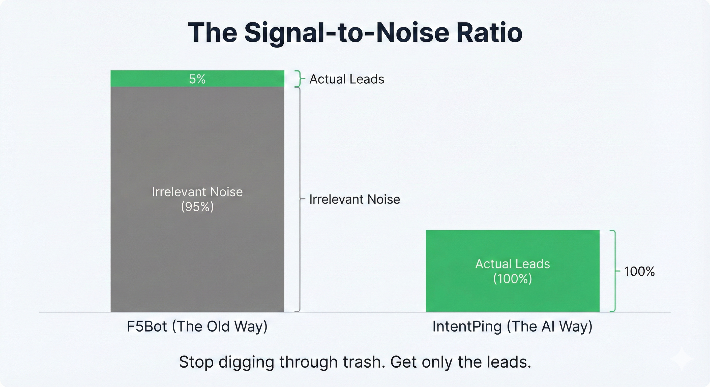 F5Bot floods your inbox with irrelevant keyword matches. IntentPing uses AI to filter noise and surface only high-intent conversations that actually matter for your business.