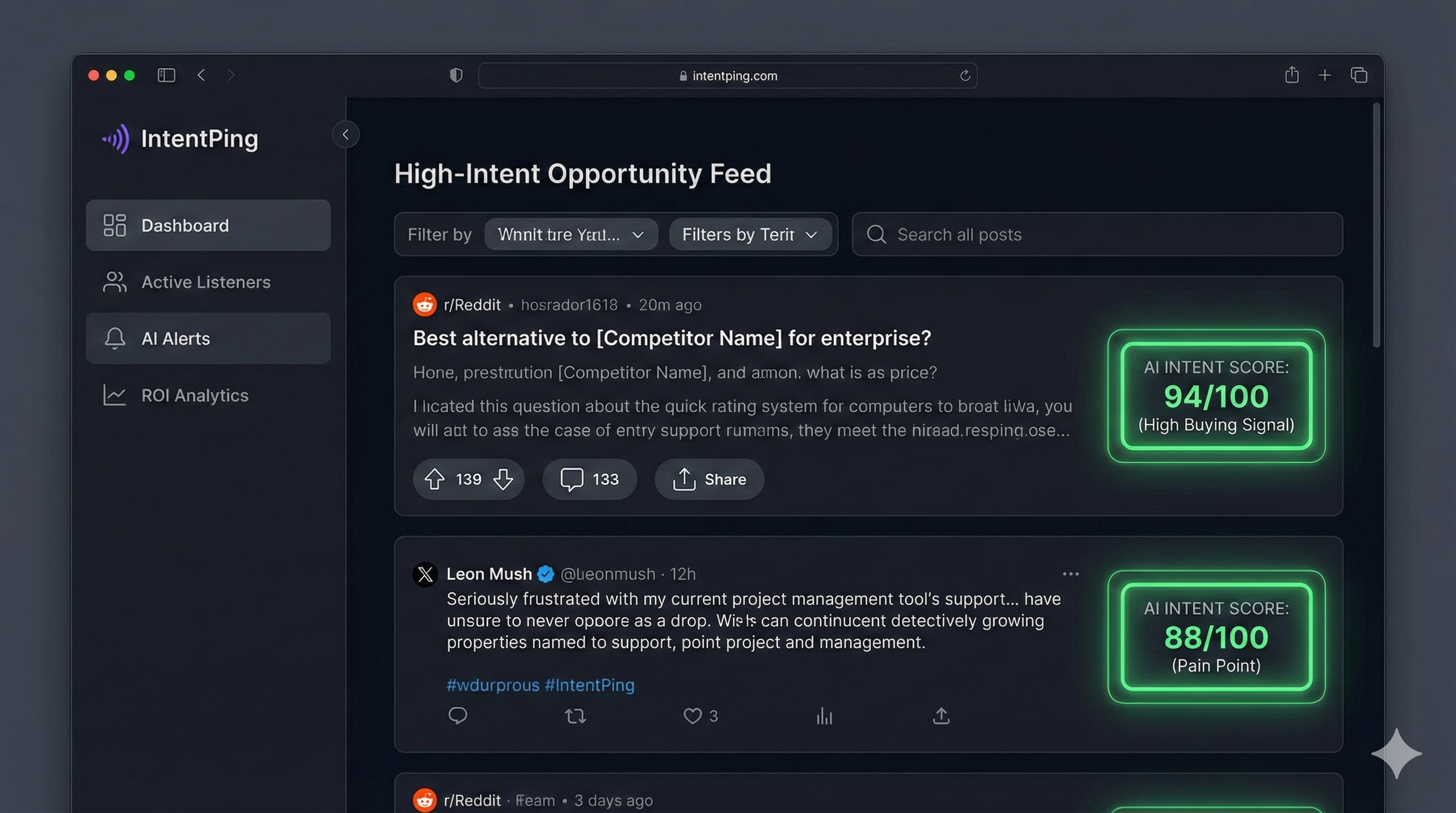 - AI-Powered Filtering: Our AI scans Reddit (with X, LinkedIn, and Bluesky coming soon) and automatically classifies posts by intent level—filtering out noise and surfacing only high-value conversations